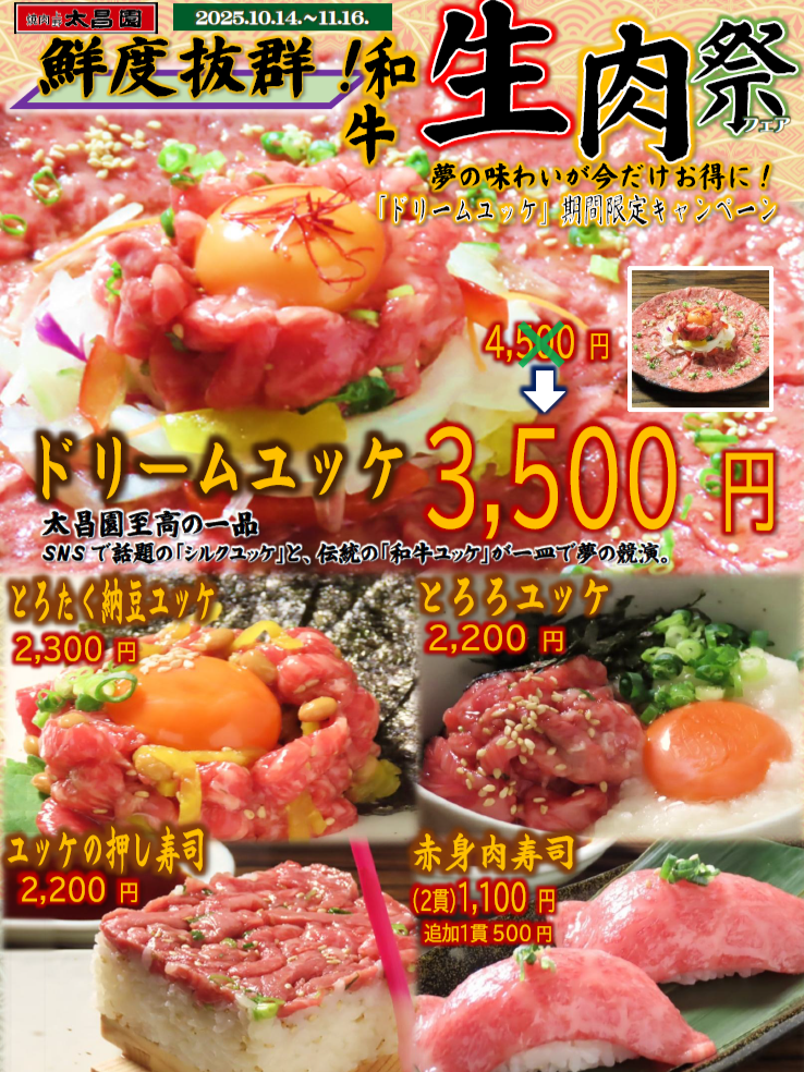 【太昌園本店・別館】10月14日(火)~11月16日(日)太昌園生肉フェア開催します 10月14日(火)~11月16日(日)太昌園生肉フェア 太昌園本店・別館 ※太昌園本店・別館限定のイベントです。太昌園上野駅前店では実施しておりませんので、ご注意ください。 ※食肉の生食につきましては食中毒の恐れがありますので、お子様、高齢者の方その他食中毒に対する抵抗力の弱い方は生食をお控え下さい。