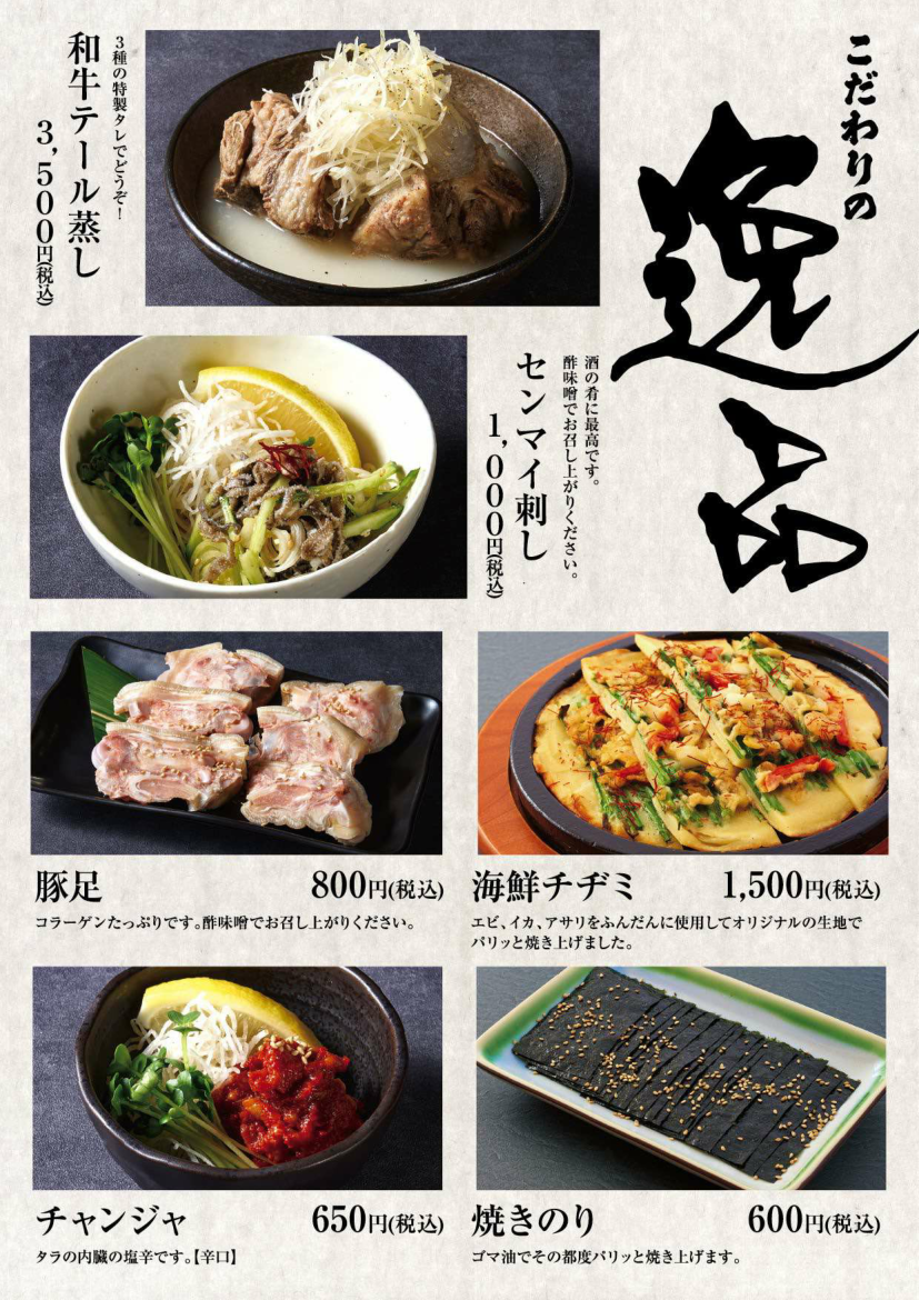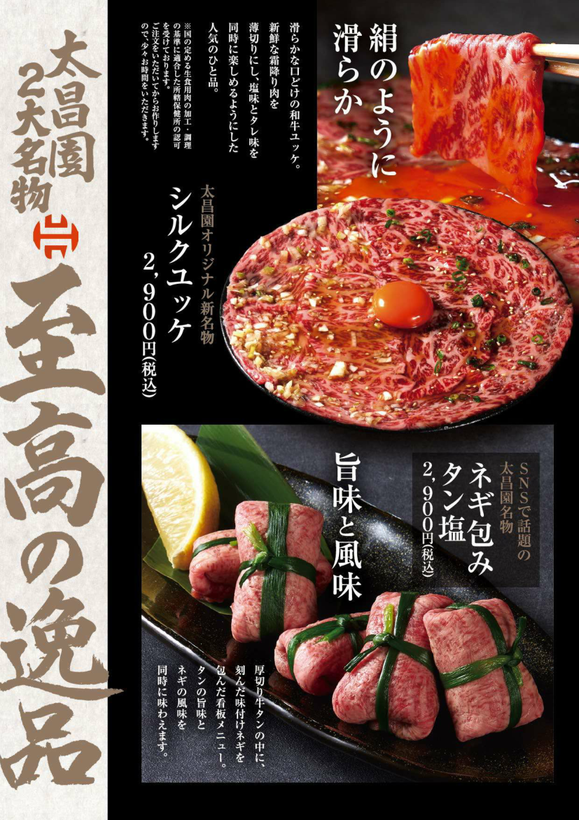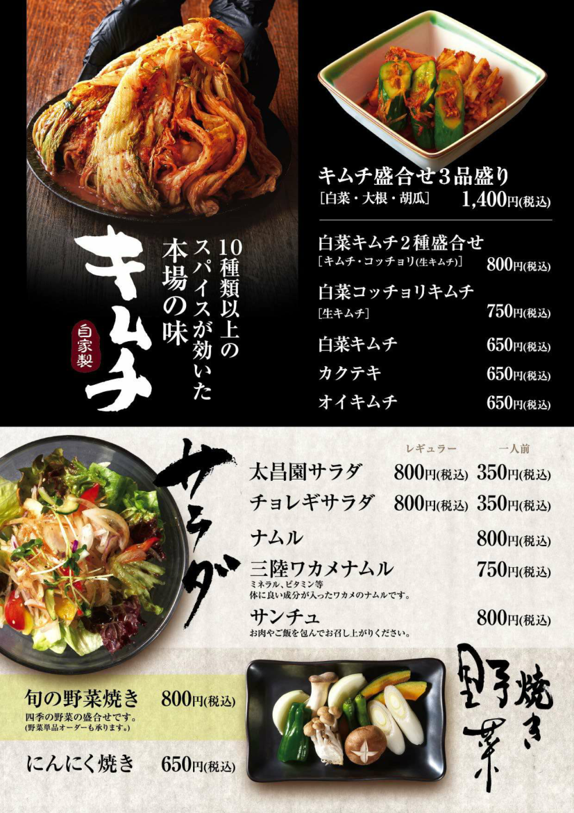 焼肉上野太昌園別館 一品料理・漬物・サラダ ホーム>店舗案内> 焼肉上野太昌園 別館 焼肉上野太昌園 別館 接待や宴会など様々なシーンでご利用いただけるお席をご用意しております。 ▶(平日)17:00-22:00(LO 21:30)、(日・祝)17:00-21:00(LO 20:15) ▶ 無料Wi-Fi完備(一部個室は繋がりにくい場所があります) ▶ 各種クレジットカード/銀聯カード、モバイル決済サービス利用可 03-3831-5335 東京都台東区上野2-5-4 サンシャインビル2F 太昌園別館ブログ・最新情報はこちら ネット予約 最新情報 宴会・接待プラン アラカルト ドリンク 店内・座席 アクセス ▶焼物 一品料理・漬物・サラダ ▶お食事・スープなど ▶全ての価格には消費税が含まれております。▶小学生までのお子様には、ジュースのサービスとおもちゃのプレゼントがあります。 ▶15時以降に個室席をご利用の場合、別途個室料を頂きます。