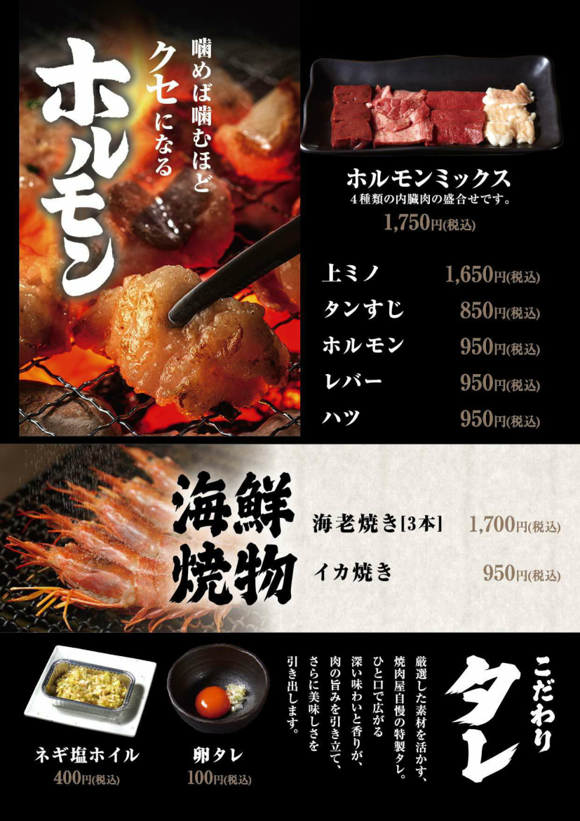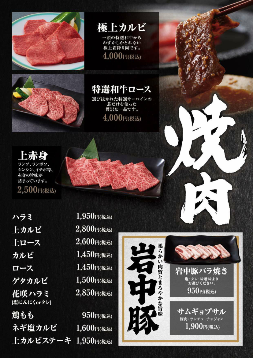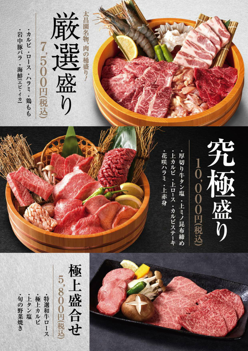 焼肉上野太昌園駅前店 アラカルト ホーム>店舗案内> 焼肉上野太昌園 駅前店 焼肉上野太昌園 駅前店 大小個室をご用意。お客様の憩いのひと時を最高のサービスにておもてなし致します。 ▶(平日)11:00-22:00(LO 21:30)、(金土曜・祝日前)11:00-23:00(LO 22:30) ▶ 無料Wi-Fi完備(NTTギガらくWi-Fi) ▶ 各種クレジットカード/銀聯カード、電子マネー、モバイル決済サービス利用可 03-3832-5324 東京都台東区上野6-13-1 フォーラム味ビル2・3F 太昌園上野駅前店ブログ・最新情報はこちら ネット予約 最新情報 宴会・接待プラン アラカルト ランチ ドリンク 店内・座席 アクセス 焼物 ▶一品料理・漬物・サラダ ▶お食事・スープなど ▶全ての価格には消費税が含まれております。▶小学生までのお子様にジュースのサービスがあります。