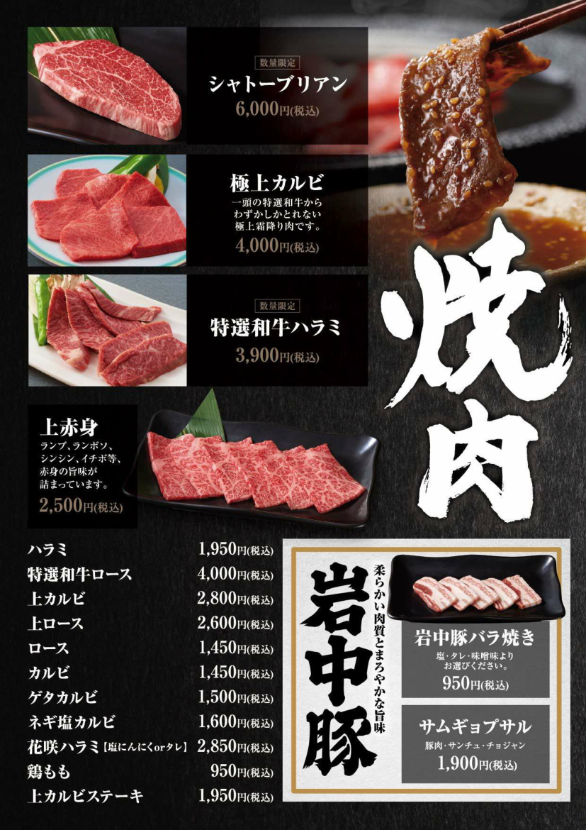 焼肉上野太昌園本店 アラカルト ホーム>店舗案内> 焼肉上野太昌園 本店 焼肉上野太昌園 本店 上野仲町通り近くで創業から変わらず同じ場所で営業を続けております。 ▶【月曜~日曜】11:00-22:00(LO 21:30)定休日なし(12/31のみ休み) ▶ 無料Wi-Fi完備(NTTギガらくWi-Fi) ▶ 各種クレジットカード/銀聯カード、モバイル決済サービス利用可 03-3831-6365 東京都台東区上野2-8-6 太昌園本店ブログ・最新情報はこちら ネット予約 最新情報 宴会・接待プラン アラカルト ランチ ドリンク 店内・座席 アクセス 焼物 ▶一品料理・漬物・サラダ ▶お食事・スープなど ▶全ての価格には消費税が含まれております。▶小学生までのお子様には、ジュースのサービスとおもちゃのプレゼントがあります。 ▶15時以降に個室席をご利用の場合、別途個室料を頂きます。